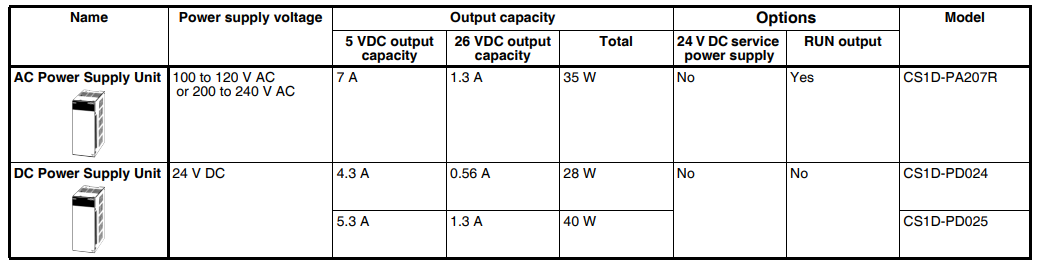 | Power supply output capacity | 5 V DC, 5.3 A (including the CPU Unit power supply) 26 V DC, 1.3 A Total: 40 W |